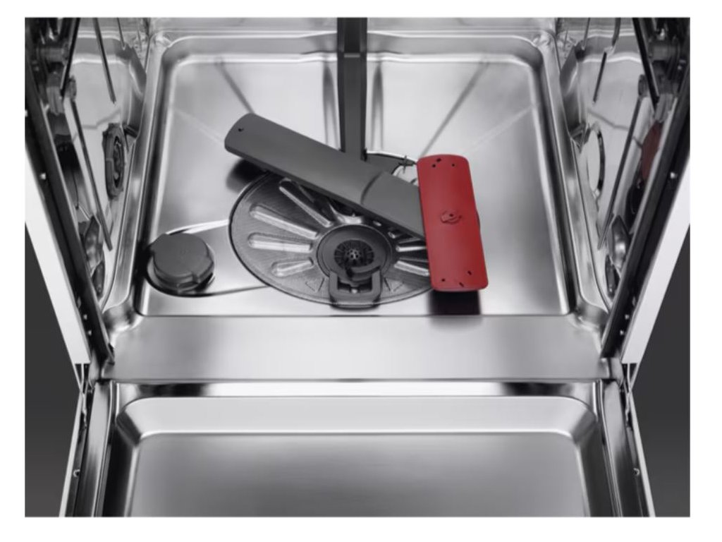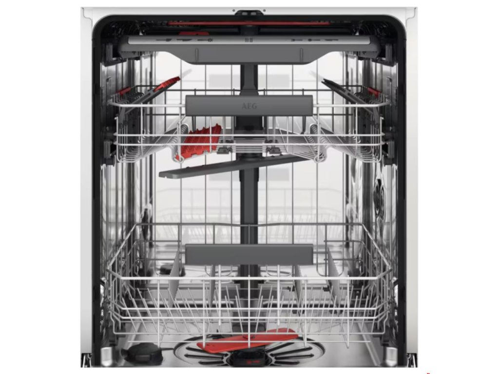 - Vlastnosti horního koše: 6 měkkých špiček pro vinné sklenky, 2 skládací držáky, 2 skládací drátěné držáky pro skleničky, 2 měkké špičky, skládací poličky na šálky, plastové madlo AEG