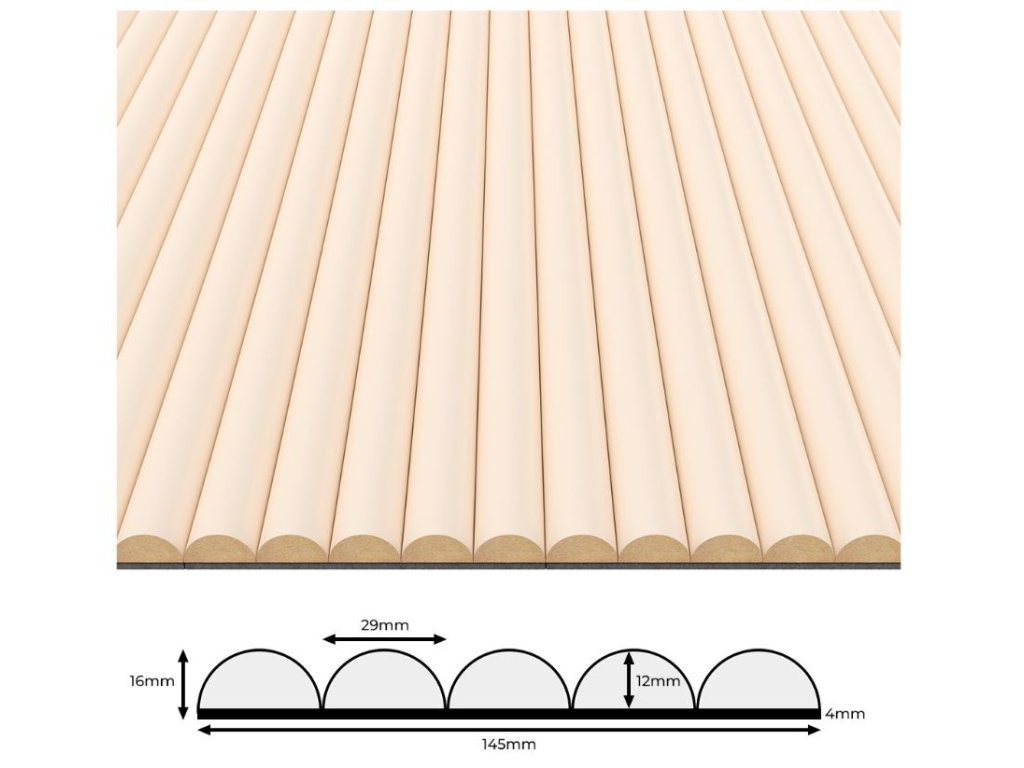Panely v elegantní barvě přinášejí do interiéru teplo a charakter. Každý panel se skládá z pěti oválných MDF lamel laminovaných na pohledové straně, připevněných na 4 mm silné černé plsti. Ta zároveň účinně pohlcuje zvuk a snižuje dozvuk v místnosti.