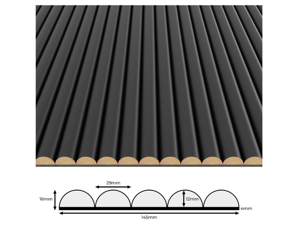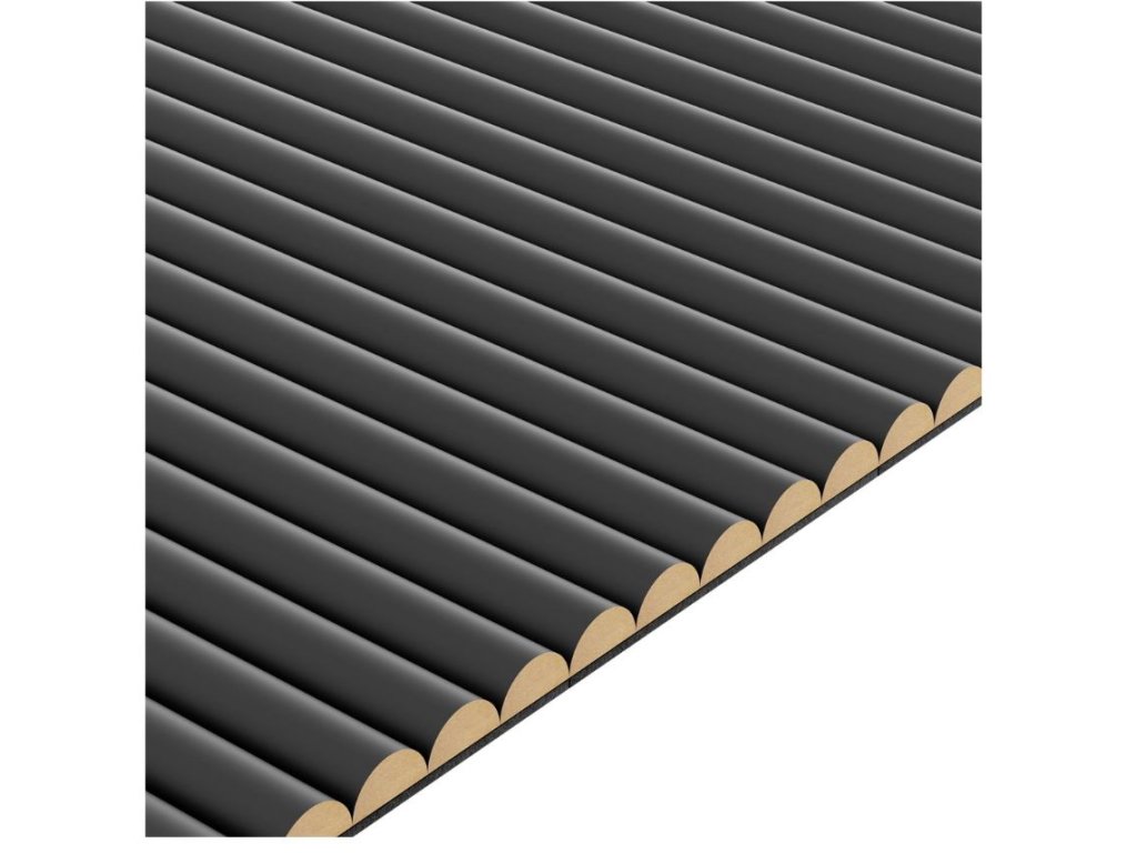 Panely v elegantní barvě přinášejí do interiéru teplo a charakter. Každý panel se skládá z pěti oválných MDF lamel laminovaných na pohledové straně, připevněných na 4 mm silné černé plsti. Ta zároveň účinně pohlcuje zvuk a snižuje dozvuk v místnosti.