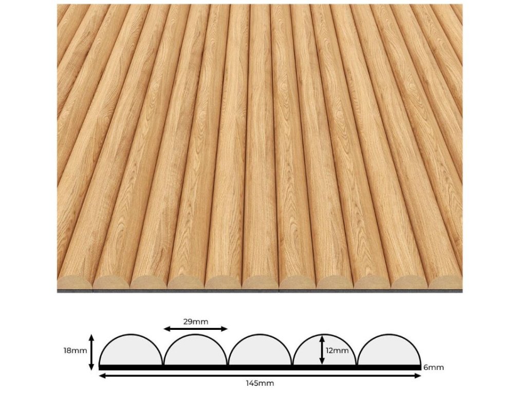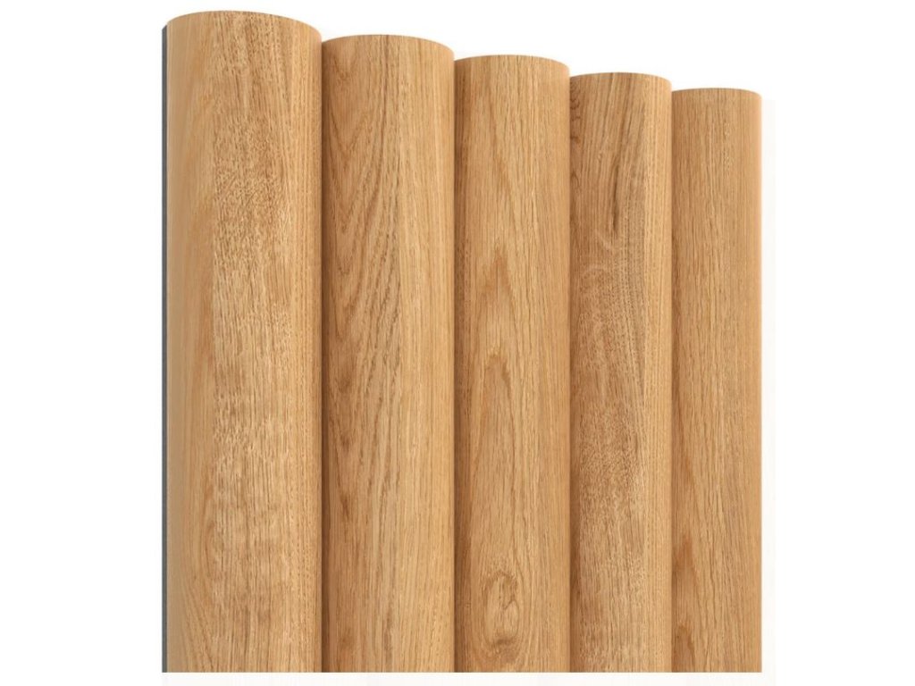 Panely v elegantní barvě přinášejí do interiéru teplo a charakter. Každý panel se skládá z pěti oválných MDF lamel laminovaných na pohledové straně, připevněných na 4 mm silné černé plsti. Ta zároveň účinně pohlcuje zvuk a snižuje dozvuk v místnosti.