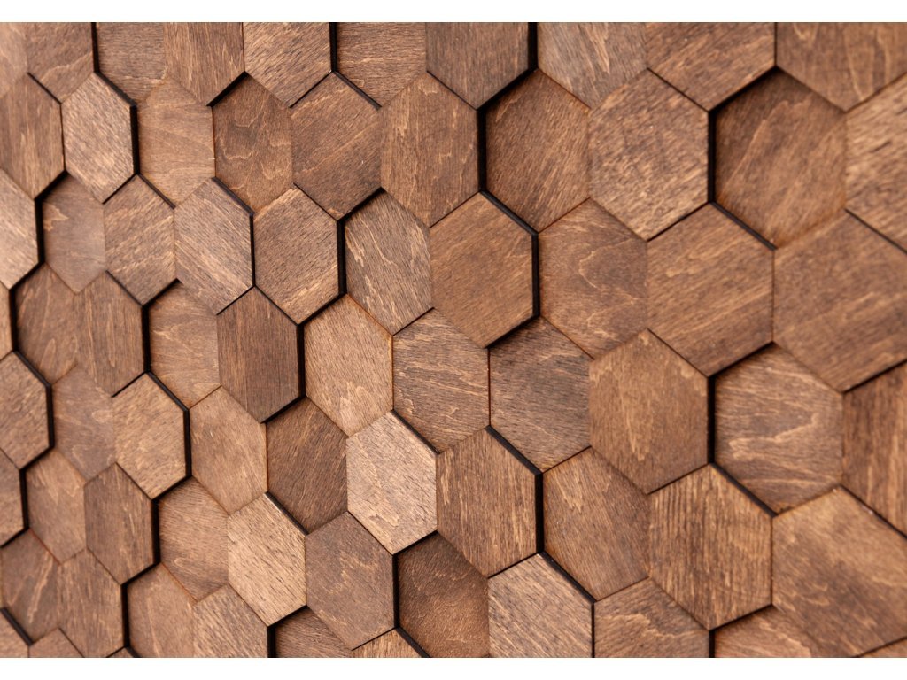 Moderní dřevěná 3D mozaika ve tvaru šestiúhelníku je dokonalým a ekologickým výrobkem, který udělá každý interiér teplým a originálním.