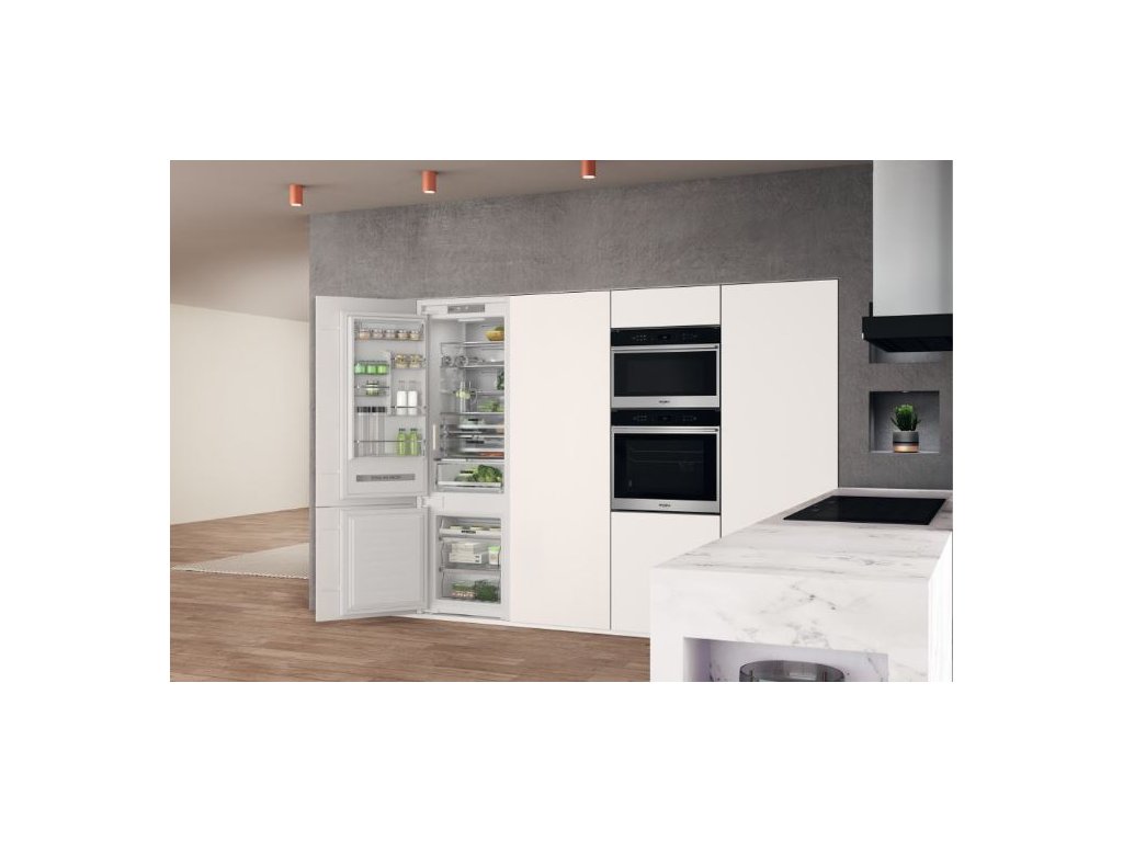 Přednosti této vestavné kombinované chladničky Whirlpool: bílá barva. Vysoký spotřebič, který vyhoví potřebám vaší rodiny. Skleněné police, které poskytují pevnost i eleganci. Ventilátor, který zajišťuje plynulé a rovnoměrné proudění vzduchu v prostoru spotřebiče pro doonalou cirkulaci vzduchu. Senzory 6. SMYSL, které automaticky snižují teplotu uvnitř spotřebiče po přidání nových potravin, čímž snižují spotřebu energie.